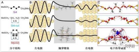 圖:電子在硅單分子導(dǎo)線中隧穿時(shí)的波函數(shù)衰減情況及電子傳導(dǎo)情況:A)直鏈硅烷分子線Si4、模擬真空縫隙硅分子線Si4-cut和橋環(huán)硅烷分子線Si[222]三種分子的結(jié)構(gòu)示意圖;B)三種分子導(dǎo)線在電子隧穿過程中的波函數(shù)衰減示意圖;C)分子導(dǎo)線中的電子傳導(dǎo)通道示意圖,箭頭的粗細(xì)與電子傳導(dǎo)元素的強(qiáng)度成正比,而箭頭顏色則代表傳輸方向,紅色箭頭表示有效的電子傳導(dǎo),藍(lán)色箭頭表示破壞性的量子干涉。