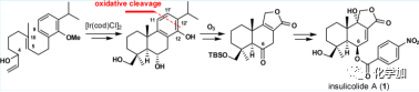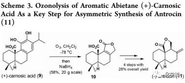 在2015年,作者曾開發(fā)出一種簡潔的不對稱合成方法,將松香烷(+)-carnosic acid(9)中富電子的酚進行臭氧分解得到中間10,再經(jīng)四步反應(yīng)合成(-)-antrocin(11)(Scheme 3)。作者擬以串聯(lián)多烯環(huán)化和苯酚臭氧分解作為關(guān)鍵步驟,進行insulicolide A的不對稱全合成,并希望開發(fā)的方法可以適用于其他家族成員的全合成。