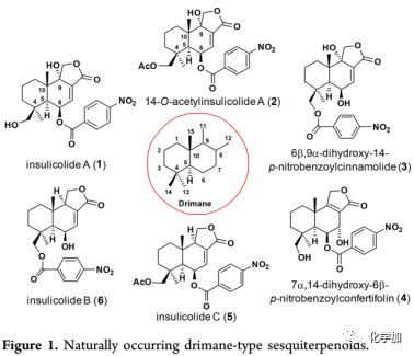 Insulicolide A(1)是一種稀有的硝基苯甲?;〈谋栋胼祁惢衔铮?/span>2-6, Figure 1),于1997年從海洋真菌Aspergillus insulicola中分離得到(J. Nat. Prod. 1997, 60, 811.),其結(jié)構(gòu)通過X射線晶體學(xué)分析確證,該化合物具有獨特的drimane型骨架,并且含有五個連續(xù)的立體中心,其中兩個是四級碳(C-4和C-10)。Insulicolide A(1)對10種人癌細胞系(H1975,U937,K562,BGC-823,Molt-4,MCF-7,A549,Hela,HL60和Huh-7)均具有顯著的細胞毒性,IC50值:2.11~6.35 μM。