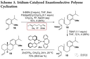 首先,利用苯乙烯16與9-BBN反應(yīng)得到硼酸酯中間體,然后在Pd催化下與乙烯基碘17進行Suzuki偶聯(lián)得到18,進一步處理脫去TBS得到多烯15。隨后,利用Carreira等人報道的反應(yīng)條件探索了Lewis酸作用下銥催化的對映選擇性多烯環(huán)化,并發(fā)現(xiàn)在20 mol%Zn(OTf)2存在情況下,環(huán)化收率可以達到73%(99.6%ee)。