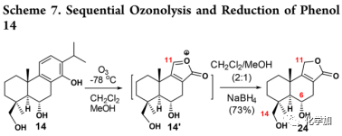 在得到苯酚14后,作者嘗試將苯酚14通過臭氧裂解構(gòu)建內(nèi)酯24(Scheme 7):當(dāng)苯酚14在-78 ℃、CH2Cl2/MeOH (2:1)條件下進行臭氧分解時,其通過兩種臭氧化物進行雙重臭氧分解以產(chǎn)生氧鎓離子14',然后經(jīng)NaBH4還原,以一鍋法操作得到產(chǎn)物24(73%)。
