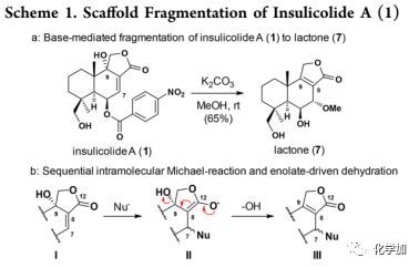 在溫和堿性條件下,利用K2CO3/MeOH可將1轉(zhuǎn)化成內(nèi)酯7,表明1在C-7位易于進行親核加成導(dǎo)致在C-9處羥基消除得到甲醚7,這可能是通過Michael加成和烯醇化脫水產(chǎn)生的(b in Scheme 1)。