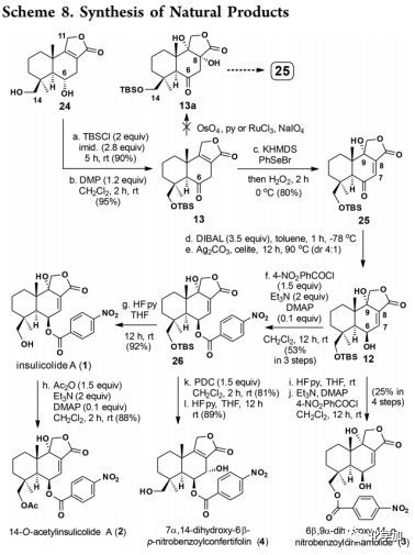 在得到內(nèi)酯24后,作者將目標轉(zhuǎn)向天然產(chǎn)物的全合成,首先需要分別在C-6和C-9立體選擇性引入兩個羥基。將24中的伯醇用TBS選擇性保護,仲醇用DMP氧化成相應(yīng)的酮13。作者首先嘗試了通過雙羥化-脫水反應(yīng)在25中引入C-9羥基,但13未發(fā)生雙羥化。隨后,作者探索了基于硒氧化物的[2,3]-σ遷移重排來合成25,即酮13經(jīng)KHMDS處理后與PhSeBr反應(yīng)得到的硒代苯基酮和H2O2反應(yīng)生成硒氧化物,再進行[2,3]-σ遷移重排得到25。經(jīng)DIBAL-H還原將酮和內(nèi)酯部分還原為相應(yīng)的醇和半縮醛,然后進行Fetizon氧化得到12(主要異構(gòu)體)及其非對映異構(gòu)體的混合物,不經(jīng)分離直接進行苯甲?;玫?/span>26(53%)及其非對映異構(gòu)體(13%)。將26脫去TBS便得到insulicolide A(1);將1乙?;玫?/span>14-O-acetylinsulicolide A(2);將底物12(作為一對C-6非對映異構(gòu)體)脫TBS產(chǎn)生的三醇與4-NO2-PhCOCl反應(yīng)以25%的收率得到6β,9α-dihydroxy-14-p-nitrobenzoyl-cinnamolide(3);在PDC的存在下,底物26發(fā)生1, 3-羥基遷移,所得產(chǎn)物脫TBS后以89%的收率得到7α,14-dihydroxy-6β-p-nitrobenzoylconfertifolin(4)。