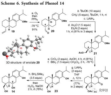 化合物19經(jīng)化學(xué)選擇性臭氧分解得到的臭氧化物用Ph3P還原得到醛20,通過用t-BuOK/t-BuOH處理醛20來引入C-4季碳手性中心,并且將得到的烯醇化物與MeI反應(yīng),然后經(jīng)LiAlH4還原和Ac2O乙酰化得到乙酸酯21。隨后,經(jīng)CrO3氧化、BBr3脫甲基得到酮22,然后用LiAlH4在THF中回流下處理22酮基經(jīng)串聯(lián)還原得到23。最后,通過硼氫化氧化實現(xiàn)區(qū)域和非對映選擇性引入C-6羥基得到苯酚14(78%)。