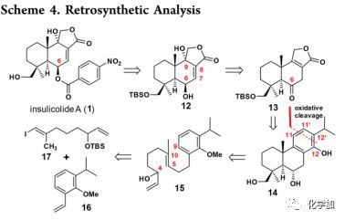 Insulicolide A(1)可由二醇12經(jīng)C-6羥基的苯甲?;兔?/span>TBS來合成,而12可以由內(nèi)酯13通過其雙鍵與H2O2/NaOH的環(huán)氧化以及堿介導(dǎo)的環(huán)氧開環(huán),或者雙鍵的雙羥化以及新生成的C-8羥基脫水來構(gòu)建。內(nèi)酯13可通過苯酚14在C-11/C-11'和C-12/C-12'處進行C-C鍵的區(qū)域選擇性氧化裂解產(chǎn)生,苯酚14則可以通過銥催化的對映選擇性多烯環(huán)化串聯(lián)反應(yīng)從外消旋的烯丙基醇15合成,而15可以通過乙烯基碘17與取代苯乙烯16進行Suzuki偶聯(lián)獲得。