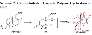 從生物合成上來看,drimane骨架可以由法尼基焦磷酸(farnesyl pyrophosphate ,FPP,8)通過陽離子引發(fā)的串聯(lián)多烯環(huán)化經(jīng)中間體IV來構(gòu)建(Scheme 2)。
