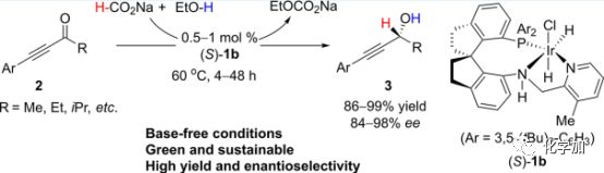 小結(jié):周其林謝建華課題組開發(fā)了一種綠色且有效的將炔基酮不對稱轉(zhuǎn)移氫化成手性炔丙醇的方法。該方法在無堿條件下,利用甲酸鈉/乙醇作為氫供體、手性螺環(huán)銥催化劑作為催化劑以高產(chǎn)率和高對映選擇性實(shí)現(xiàn)了炔基酮不對稱轉(zhuǎn)移氫化,為制備光學(xué)活性炔丙醇提供了實(shí)用且可持續(xù)的方法。