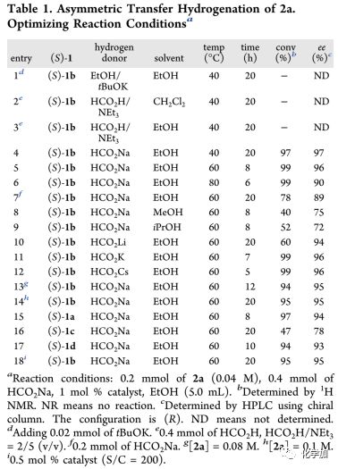 Table1:不對稱轉(zhuǎn)移氫化反應(yīng)條件優(yōu)化:催化劑、堿、溶劑以及反應(yīng)溫度和時(shí)間的篩選