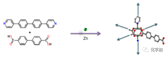 圖1. 文中使用的配體結(jié)構(gòu)圖及形成金屬-有機(jī)材料中的pcu拓?fù)渚W(wǎng)絡(luò)的示意圖。