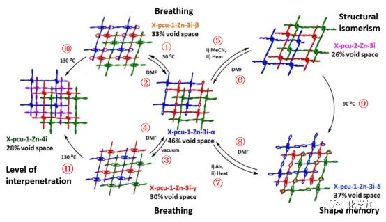 圖2. 金屬-有機(jī)材料X-pcu-1-Zn-3i-α的6種物相及其相互轉(zhuǎn)化過(guò)程與表現(xiàn)出的4種類型的刺激響應(yīng)行為的示意圖。