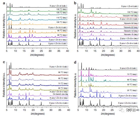 圖3. 原位變溫粉末衍射圖:表征金屬-有機(jī)材料X-pcu-1-Zn-3i-α受相關(guān)外界刺激發(fā)生響應(yīng)的過(guò)程。