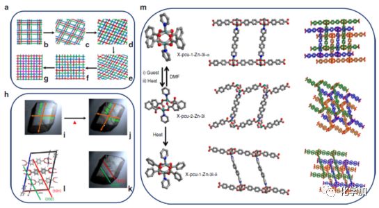 圖5. a)X-pcu-1-Zn-3i-α轉(zhuǎn)變成X-pcu-1-Zn-4i的機(jī)理推斷示意圖;h)X-pcu-1-Zn-3i-α的光學(xué)熱顯微鏡圖;m)X-pcu-1-Zn-3i-α、X-pcu-2-Zn-3i和X-pcu-1-Zn-3i-δ之間轉(zhuǎn)化過(guò)程中金屬節(jié)點(diǎn)異構(gòu)化的示意圖。