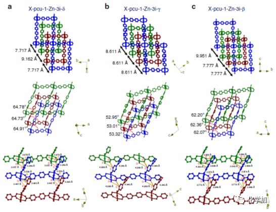濕度和溫度變化引起的形狀記憶效應(yīng)。如圖2的⑦過(guò)程所示,經(jīng)原位的變溫粉末衍射(如圖3c所示)驗(yàn)證,X-pcu-1-Zn-3i-α經(jīng)空氣中暴露和氮?dú)夥諊?0 oC加熱轉(zhuǎn)變成X-pcu-1-Zn-3i-δ。同樣地,X-pcu-1-Zn-3i-δ經(jīng)DMF浸泡后依然可以恢復(fù)成X-pcu-1-Zn-3i-α結(jié)構(gòu)(如圖2的⑧過(guò)程所示);同時(shí),X-pcu-2-Zn-3i在90 oC下加熱12小時(shí)后也能轉(zhuǎn)變成X-pcu-1-Zn-3i-δ(如圖2的⑨過(guò)程所示)。而關(guān)鍵的是,X-pcu-1-Zn-3i-δ吸附氣體前后的粉末衍射顯示物相沒(méi)有發(fā)生變化,說(shuō)明X-pcu-1-Zn-3i-δ具有形狀記憶效應(yīng)。作者們通過(guò)細(xì)致分析與對(duì)比X-pcu-1-Zn-3i-δ、X-pcu-1-Zn-3i-γ和X-pcu-1-Zn-3i-β的單晶結(jié)構(gòu)(如圖4所示),得出晶體網(wǎng)格之間的相互作用以及節(jié)點(diǎn)與連接子間的應(yīng)變減少是引起這種動(dòng)力學(xué)穩(wěn)定的形狀記憶效應(yīng)的原因。