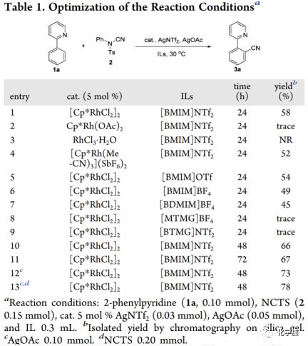 近年來,離子液體(ILs)在有機合成中已被廣泛用作穩(wěn)定且可回收的反應(yīng)介質(zhì)和催化劑。與傳統(tǒng)的有機試劑相比,離子液體具有熔點低、毒性低、電導(dǎo)率高、化學(xué)穩(wěn)定性好、熱穩(wěn)定性好、溶解性好、易于回收利用等獨特的優(yōu)點。迄今為止,離子液體已成功應(yīng)用于Suzuki反應(yīng)、Heck 反應(yīng)、Michael加成,Diels-Alder環(huán)加成反應(yīng)和立體選擇性鹵化反應(yīng)等,然而,它們在C-H活化氰化中的應(yīng)用尚未見報道。
