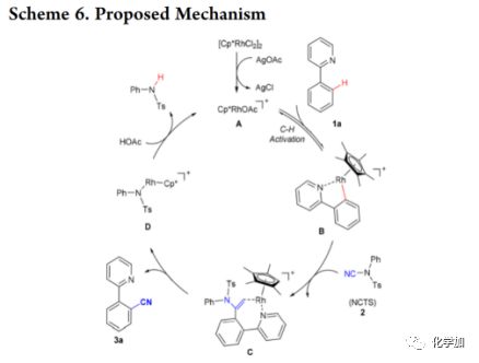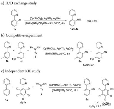 為了闡明該反應(yīng)的機理,作者進行了一系列實驗。H/D交換實驗經(jīng)1H NMR譜監(jiān)測到1a中40%的鄰位C-H鍵被氘化,這表明C-H活化是可逆的。1c和1f的分子間競爭實驗表明C-H鍵氰化反應(yīng)有利于富電子底物。在相同條件下,作者利用1a和d5-1a與偶聯(lián)劑NCTS(2)進行反應(yīng),測得其動力學(xué)同位素效應(yīng)值kH/kD為2.8,這表明C-H鍵斷裂是反應(yīng)的決速步。