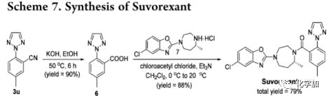重要的是,芳香族氰化物作為藥物設(shè)計的合成砌塊具有重要意義。例如,上市藥物SuvxEnter是一種新型食欲素拮抗劑,且已成為治療原發(fā)性失眠癥的一類新型藥物。作者利用5-甲基-2-(2H-1,2,3-三唑-2-基)-芐腈(產(chǎn)物3u)經(jīng)兩步合成Suvorexant,產(chǎn)率為79%。該成果可能為藥物的設(shè)計和合成提供新思路。