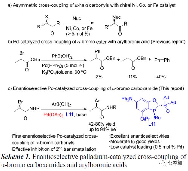 過(guò)渡金屬催化的不對(duì)稱芳基-烷基交叉偶聯(lián)反應(yīng)受到化學(xué)家們的極大關(guān)注,且已經(jīng)取得了不錯(cuò)的進(jìn)展,但其催化劑用量較高,因此開發(fā)實(shí)用、有效的不對(duì)稱芳基-烷基交叉偶聯(lián)反應(yīng)顯得尤為重要。簡(jiǎn)單易得的α-鹵代羰基化合物與芳基金屬試劑的不對(duì)稱交叉偶聯(lián)反應(yīng)是制備手性α-芳基羰基化合物最強(qiáng)有力的方法之一。Fu課題組、鐘江春和邊慶花團(tuán)隊(duì)以及Nakamura課題組已成功應(yīng)用手性Ni,Co和Fe等過(guò)渡金屬催化該類不對(duì)稱交叉偶聯(lián)反應(yīng),但其催化劑用量普遍> 5mol%(Scheme 1a)。若將上述催化劑換成低催化劑用量的Pd催化似乎是個(gè)不很好地解決辦法。到目前為止,已有關(guān)于低催化劑用量的Pd催化α-溴代酯和苯硼酸的偶聯(lián)反應(yīng)的報(bào)道,但其主產(chǎn)物為苯硼酸發(fā)生自身偶聯(lián)反應(yīng)生成的還原酯和聯(lián)苯(Scheme 1b)。在上述背景研究的基礎(chǔ)上,中科院上海有機(jī)化學(xué)研究所湯文軍團(tuán)隊(duì)報(bào)道了第一例Pd催化α-溴代酰胺化合物與芳基硼酸的不對(duì)稱交叉偶聯(lián)反應(yīng),能以良好的收率和優(yōu)異的對(duì)映選擇性得到一系列手性α-芳基酰胺化合物。