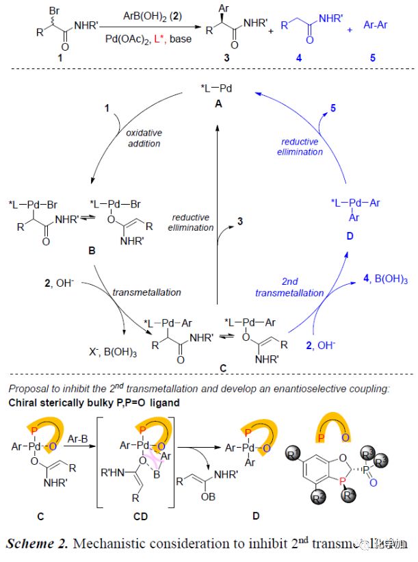 Pd催化α-鹵代羰基化合物與芳基硼酸的交叉偶聯(lián)反應(yīng)一直難以實(shí)現(xiàn)的主要原因是:Pd(0)中間體A促使α-鹵代羰基化合物1發(fā)生氧化加成反應(yīng)生成O-烯醇化物或C-烯醇化物B。B與芳基硼酸2發(fā)生過(guò)渡金屬轉(zhuǎn)移反應(yīng)會(huì)生成Pd(II)中間體C。C一般不會(huì)直接發(fā)生還原消除反應(yīng)得到偶聯(lián)產(chǎn)物3,而會(huì)與芳基硼酸進(jìn)行第二次過(guò)渡金屬轉(zhuǎn)移過(guò)程生成4和Pd(II)中間體D。緊接著,D發(fā)生還原消除反應(yīng)生成5(Scheme 2)。為了得到理想的偶聯(lián)產(chǎn)物3,作者猜想應(yīng)用空間位阻較大的磷配體可以有效地抑制C的第二次金屬轉(zhuǎn)移反應(yīng),從而實(shí)現(xiàn)Pd催化α-溴羰基化合物的不對(duì)稱交叉偶聯(lián)反應(yīng)。