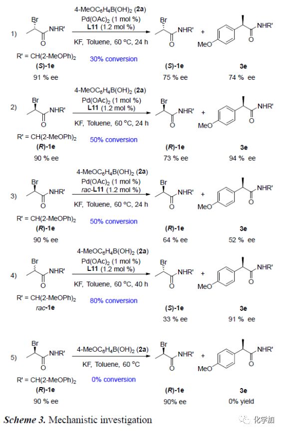 外消旋α-溴代甲酰胺化合物能發(fā)生偶聯(lián)反應(yīng),說(shuō)明該交叉偶聯(lián)反應(yīng)為動(dòng)力學(xué)拆分過(guò)程。為了進(jìn)一步了解催化劑和絡(luò)合物L11在該反應(yīng)中所起的作用,作者進(jìn)行了一系列對(duì)照實(shí)驗(yàn)(Scheme 3)。首先,作者分別制備了純的(S)-1e和(R)-1e分別在標(biāo)準(zhǔn)條件下反應(yīng),發(fā)現(xiàn):(S)-1e和(R)-1e均轉(zhuǎn)化為相同構(gòu)型的產(chǎn)物3e,但3e的對(duì)映選擇性不同且(R)-1e的轉(zhuǎn)化率高于(S)-1e的轉(zhuǎn)化率(equations 1&2)。若將手性L11換成消旋的,其它條件保持不變,(R)-1e可以50%的轉(zhuǎn)化率和52%的對(duì)映選擇性得到相應(yīng)產(chǎn)物(equations 3)。當(dāng)反應(yīng)轉(zhuǎn)化率達(dá)到80%時(shí)終止反應(yīng),可以91%對(duì)映選擇性分離出產(chǎn)物3e,同時(shí)以33%ee的對(duì)映選擇性回收1e(equations 4)。標(biāo)準(zhǔn)條件下,不加入Pd催化劑,該反應(yīng)不能得到目標(biāo)產(chǎn)物(equations 5)。這些對(duì)照實(shí)驗(yàn)說(shuō)明Pd催化劑決定反應(yīng)能否發(fā)生,而手性配體決定產(chǎn)物的構(gòu)型。