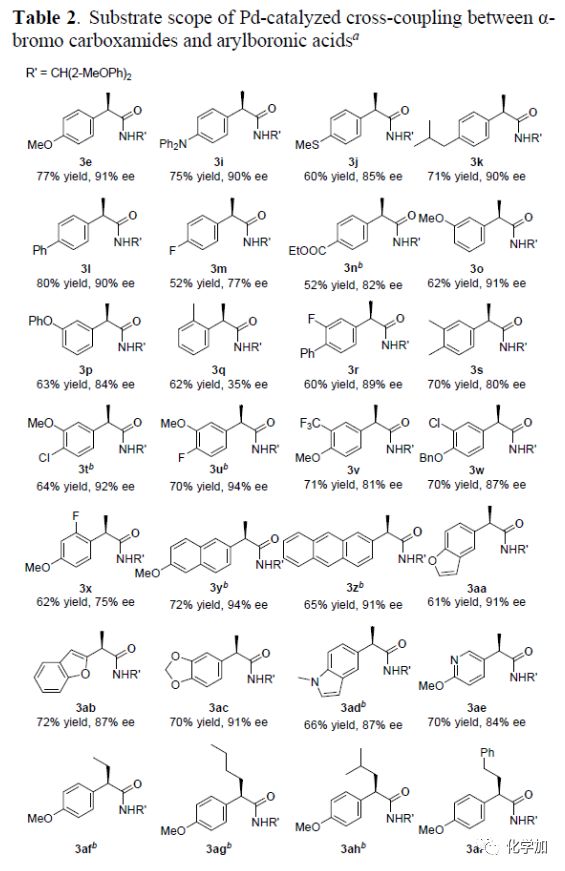 以N-二苯甲基-2-溴丙酰胺1a和4-甲氧基苯硼酸2a為模板底物,作者對(duì)反應(yīng)條件進(jìn)行反復(fù)篩選,確定最優(yōu)條件為(Table 1):N-二鄰甲氧基苯甲基-2-溴丙酰胺1e和4-甲氧基苯硼酸2a為模板底物,1 mol% Pd(OAc)2和1.2 mol %L11為催化劑,2.0 equiv KF為堿,甲苯為溶劑,在60oC條件下反應(yīng)48 h,能以77%的收率和91%的對(duì)映選擇性得到目標(biāo)產(chǎn)物。