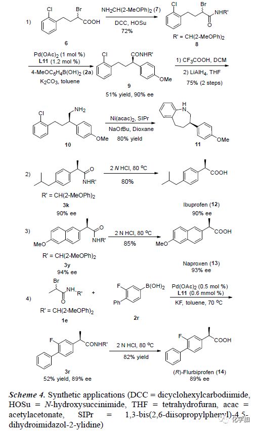 為了證明該反應(yīng)的應(yīng)用潛力,作者進(jìn)行了一系列衍生反應(yīng)合成各種治療性藥物(Scheme 4)。α-溴代羧酸6與NH2 CH(2-MeOPh)2在DCC和HOSu條件下可轉(zhuǎn)化為酰胺8。8與2a可在Pd(OAc)2和L11催化作用下發(fā)生偶聯(lián)反應(yīng)生成9。9在TFA作用下脫掉R’保護(hù)基,緊接著,LiAlH4還原可得到伯胺10。10可在Ni催化作用下發(fā)生分子內(nèi)C-N鍵偶聯(lián)反應(yīng),能以80%的收率得到治療神經(jīng)系統(tǒng)疾病的藥物11。同時(shí),3k和3y在酸性高溫條件下能良好的收率轉(zhuǎn)化為非甾體類抗炎藥布洛芬12和鎮(zhèn)痛藥萘普生13。為了證明該反應(yīng)的實(shí)用性,作者又進(jìn)行了克級(jí)反應(yīng),能以52%的收率和89%的對(duì)映選擇性得到產(chǎn)物3r。3r在酸性高溫條件下能轉(zhuǎn)化為(R)-氟比洛芬15。