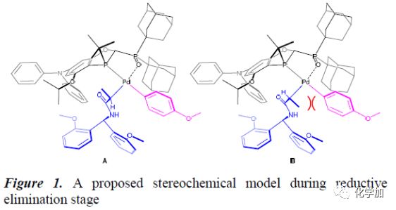 作者提出了Pd(II)絡(luò)合物在還原消除過(guò)程中的立體化學(xué)模型(Figure 1)?;谧髡咧暗膱?bào)道以及空間位阻的影響,異構(gòu)體A和B是還原消除過(guò)程最主要的中間體。其中,異構(gòu)體B主要與還原消除或過(guò)渡金屬轉(zhuǎn)移過(guò)程相關(guān),而異構(gòu)體A則與偶聯(lián)產(chǎn)物的生成以及產(chǎn)物的立體選擇性相關(guān)。