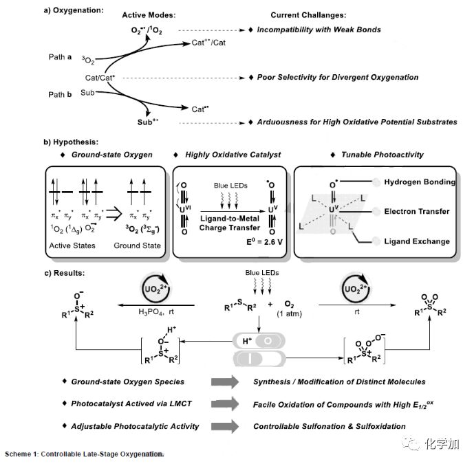 近日,華東師范大學(xué)姜雪峰教授課題組報道了鈾?;栯x子光催化基態(tài)氧參與的硫化物選擇性后期氧化反應(yīng)(Scheme 1c)。該方法通過機理研究闡述了基態(tài)氧在光催化反應(yīng)中的關(guān)鍵作用,對比了與傳統(tǒng)光催化劑的不同之處,并完成了一系列復(fù)雜藥物合成及精準(zhǔn)修飾。