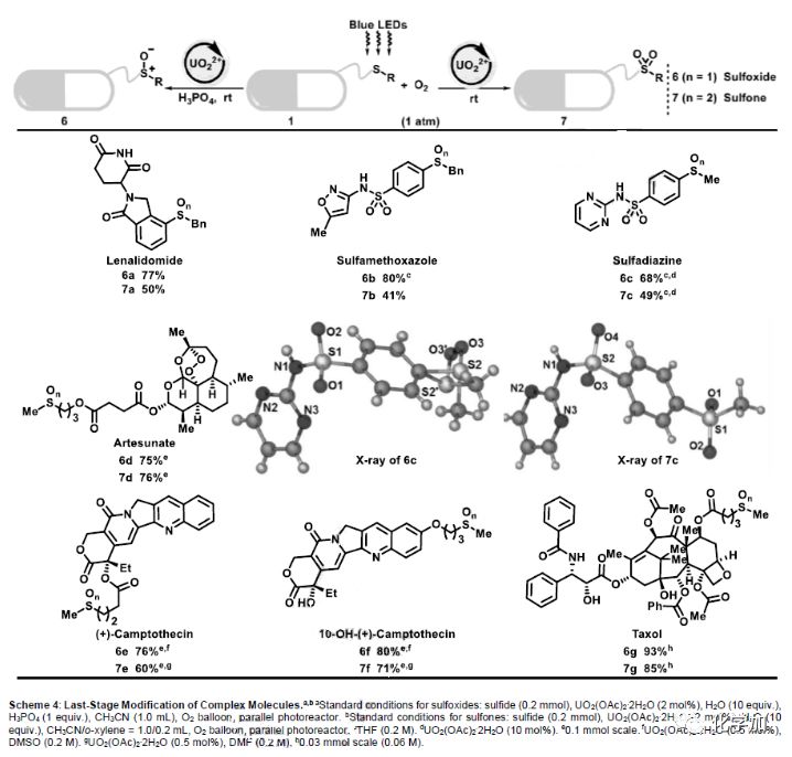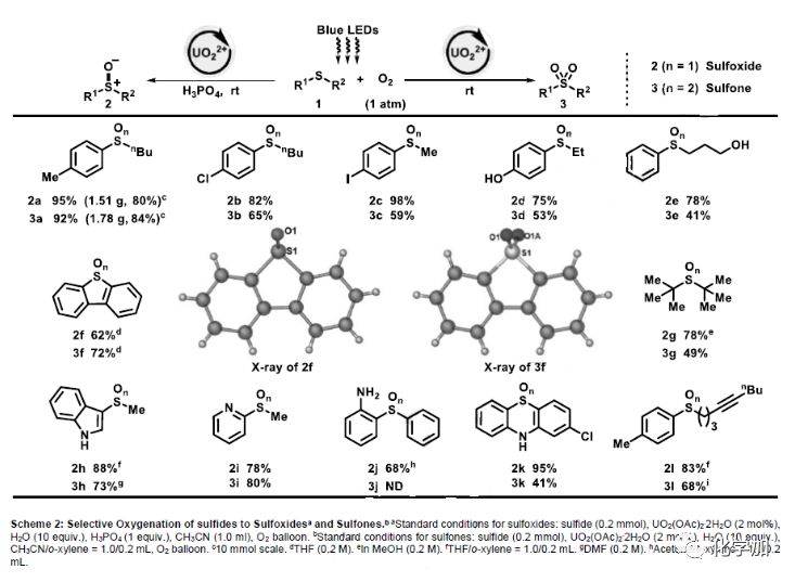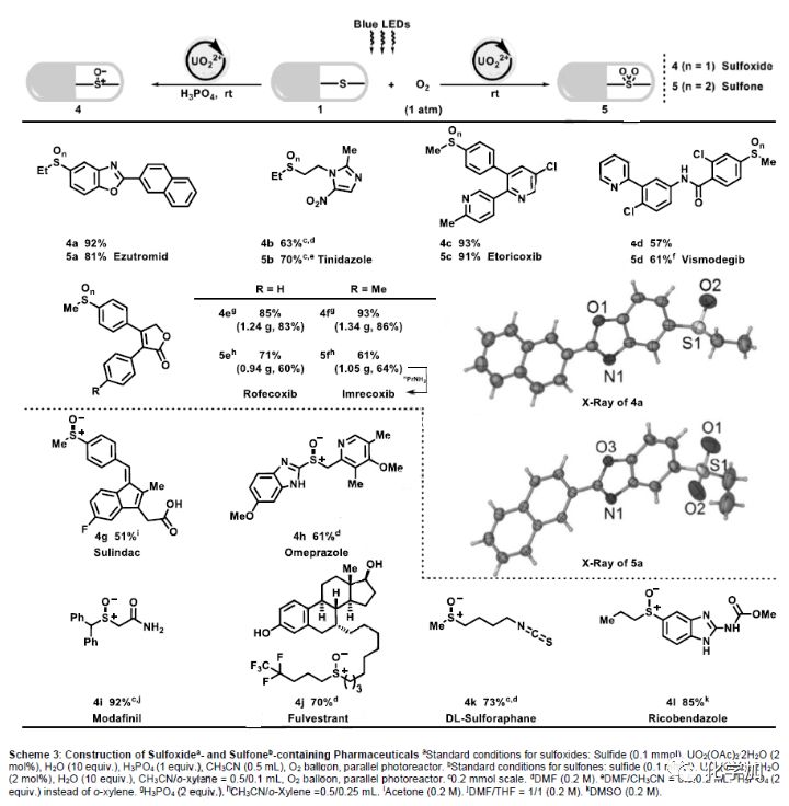 在最優(yōu)條件下,作者考察了鈾?;栯x子催化的砜和亞砜氧化反應(yīng)的普適性(Scheme 2)。在標(biāo)準(zhǔn)條件下,2a和3a能高效地進行克級規(guī)模制備。鹵素(2b和3b),甚至光敏碘(2c和3c)的耐受性都很好。酚 (2d和3d)和醇類化合物(2e和3e)均能被有效制備。二苯并[b,d]噻吩(2f和3f)的氧化反應(yīng)也能順利進行,其產(chǎn)物是重要的OLED材料。具有高空間位阻和弱C-S鍵的二叔丁基硫化物也可完成選擇性氧化(2g和3g)。此外,各種含氮骨架,如未保護的吲哚(2h和3h)和吡啶(2i和3i)也能耐受。含未保護的伯芳胺(2j)的底物也能以中等產(chǎn)率實現(xiàn)轉(zhuǎn)化,但由于胺對UO22+的強淬滅作用,相關(guān)砜的合成未實現(xiàn)。10H-吩噻嗪是合成抗精神病藥物(氯丙嗪,美索丙嗪,氟奮乃靜,硫利達嗪)的關(guān)鍵中間體,其能夠在無需保護胺的情況下進行選擇性氧化(2k和3k)。即使在氧合條件下敏感的內(nèi)部炔烴,也是兼容的(2l和3l)(Scheme 2)。