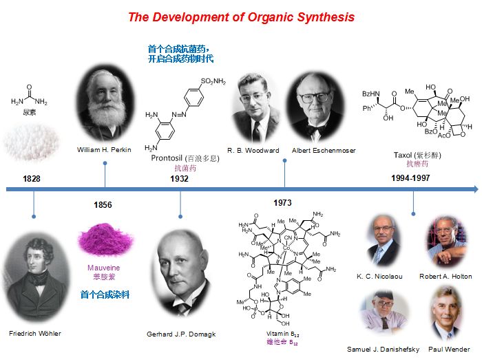 在合成化學上一個里程碑式的工作是1932年Domagk合成出第一類的抗生素的藥物,于我們大家非常熟悉的青霉素的發(fā)展還要早個近10年,作為首個合成藥物真正開啟了合成。在人類利用合成化學征服自然、改造自然的過程中,其中有很多里程碑式的工作,比如說像Woodward他完成了維生素B12非常復雜的工作。這標志著人類可以不依賴于生命體,制造出自然界中存在的最復雜的有機分子。但是在近期有很多制藥工業(yè)的發(fā)展依賴于合成化學。所以合成化學經(jīng)歷了將近兩百年的發(fā)展,為人類社會的文明起到了很大的推動作用。