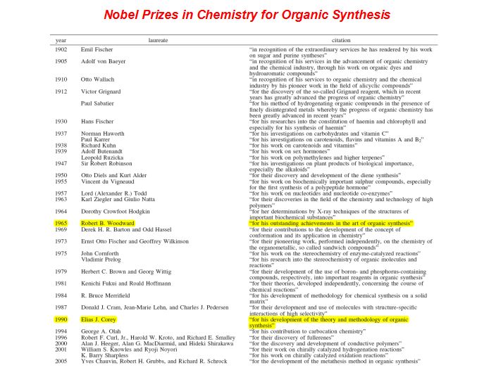 在所有的獲獎人里邊,是Robert B. Woodward和Elas J. Corey開辟了合成化學最偉大的時代,而且確立了合成化學不光是一門科學,同樣也是一門藝術(shù)。