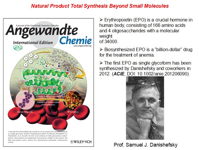 合成化學的成就不僅在于我們可以通過合成化學制備出有機小分子,后期的合成化學還可以完成如生物大分子之類。比如說中國科學家所完成的牛胰島素的人工合成,以及近期Danishefsky教授首次實現(xiàn)了生物大分子藥物,紅細胞聲稱素EPO的人工合成,從而推進了抗貧血癥的藥物研發(fā)的過程。這個分子,實際上是一個含有166個氨基酸和4個多糖結(jié)構(gòu)的糖蛋白的分子,這可能是迄今為止人類所能合成出來的最大的生物分子,也具有非常重要的里程碑的意義。