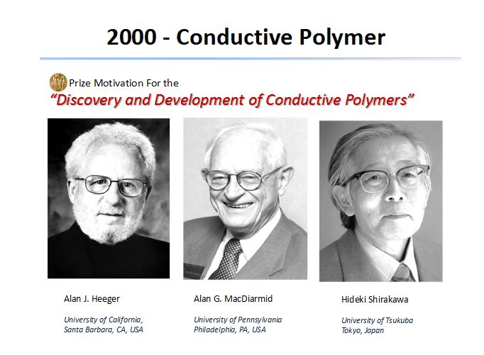 像我們?nèi)粘I钪袝玫胶芏嗟挠袡C光電材料,比如說手機、電視等等這些材料實際上都是來自于導電高分子材料的發(fā)展和高效合成。所以在這個領(lǐng)域也是諾貝爾獎級的工作,在2000年諾貝爾化學獎就授予了這三位科學家,他們發(fā)現(xiàn)了導電高分子材料的高效制備,從而豐富了我們的日常生活。