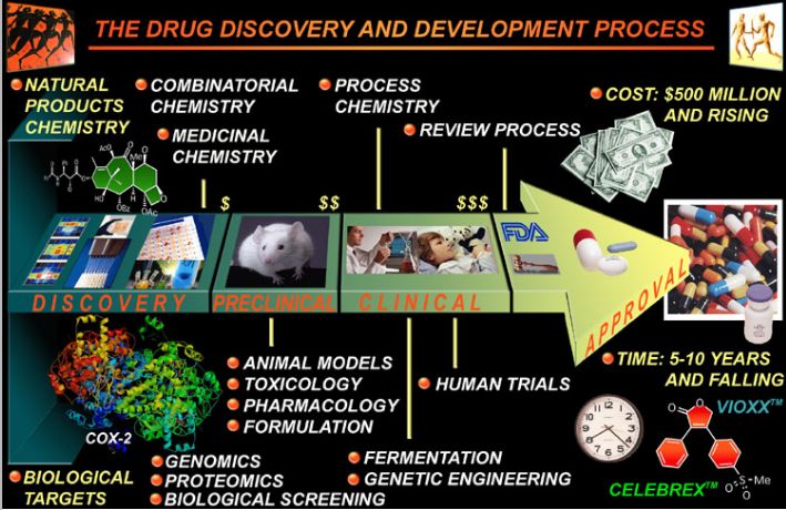 所以我們現(xiàn)在提到合成化學對于制藥工業(yè)的貢獻,就不得不說一說創(chuàng)新藥物整個研發(fā)過程。我們知道創(chuàng)新藥物實際上是一個非常漫長的過程,它大概可以分成兩個階段,一個是前期的discovery的階段,還有后期的development階段。對于合成化學來講,其實我們主要是聚焦在前期drug discovery的階段,這里邊其實合成化學扮演著一個非常核心的中心的地位,特別是小分子藥物的開發(fā),需要合成化學家去高效的制備出很多的候選藥物分子,通過進一步和生物學家、藥理學家合作,對這些分子進行評價,從而獲得有效的候選藥物,進而在動物水平以及后期的人體臨床的過程中進一步評價,最終可以把這個藥物推向市場。
