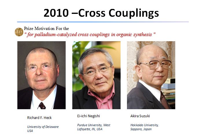 近期可能對于合成化學來講,最重要的一個成就就是交叉偶聯(lián)反應,Cross Coulpling Reaction。這是近期在2010年授予的諾貝爾化學獎,有三位科學家分享了這個獎項,包括Heck偶聯(lián)、Negishi偶聯(lián)以及Suzuki偶聯(lián)。這個合成化學的工作,其實是極大的推動了制藥工業(yè)的發(fā)展,目前有很多小分子藥物的發(fā)現(xiàn),以及工業(yè)化的生產(chǎn)都是通過這一類偶聯(lián)的合成化學方法來實現(xiàn)的。