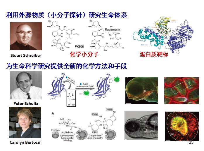 所以合成化學實際上在制藥工業(yè)界扮演著非常重要的角色,同樣合成化學也可以幫助人類去進一步的理解生命的過程,所以這也就孕育著合成化學與生命科學的一個交叉的新興的研究領(lǐng)域,叫做化學生物學。其實很多早期的化學生物學家都是合成化學家,比如說像哈佛大學的Stuart Schreiber教授,他最早實際上是做天然產(chǎn)物全合成出身,后邊他通過對于天然產(chǎn)物的合成,以及后邊對他進行探針化,利用這些天然產(chǎn)物外援性的小分子探針去研究生命體系,他揭示了很多新的生物靶點和新的生物作用機制。