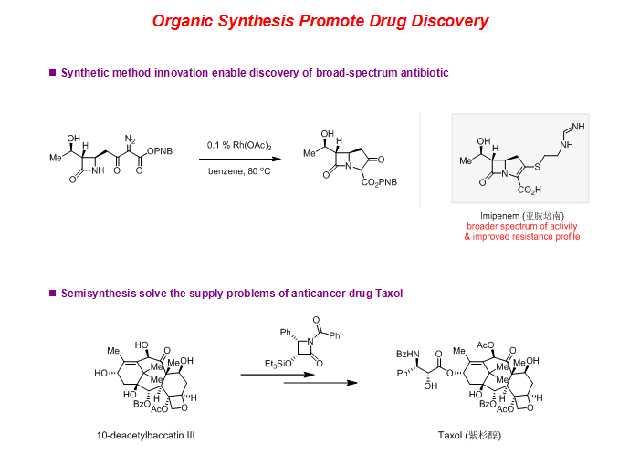 除了我們對這些藥物分子實現(xiàn)全合成以外,還有很多合成化學可以參與的,比如說半合成,我們可以通過從生物發(fā)酵獲得的原料出發(fā),對它進行相應的修飾,那我們就可以進一步的去提高,從自然界中分離出來的藥物分子的活性,比如像很多抗生素的開發(fā),都是通過半合成,像亞胺培南(β-內(nèi)酰胺類)抗生素就是通過化學的半合成來實現(xiàn)的。