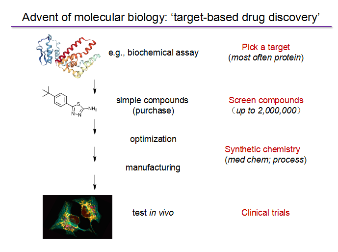當分子生物學蓬勃發(fā)展以來,我們現(xiàn)在創(chuàng)新藥物的研發(fā)又有一個新的策略,就是基于一個靶點導向的創(chuàng)新藥物的發(fā)現(xiàn)。這里邊實際上是早期的生物學家扮演著很重要的角色,首先通過生物學的發(fā)現(xiàn),你可以找到一個藥物靶點,再通過大規(guī)模的篩選化合物,就可以獲得對藥物靶點這么一個調(diào)控的分子。同樣合成化學也扮演著一個很重要的角色,只有通過合成化學,才能夠?qū)@些化合物進行結(jié)構(gòu)優(yōu)化改造,獲得構(gòu)效關(guān)系,最終能夠推進這個藥物的研發(fā)。