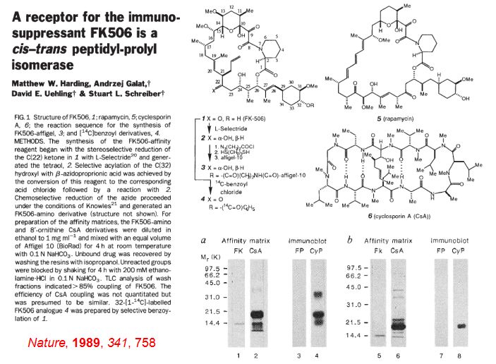 舉兩個實例,從合成化學出發(fā),我們?nèi)ミM一步幫助我們理解生命過程,去發(fā)現(xiàn)新的生物機制。比如說最經(jīng)典的,Stuart Schreiber教授,他們在九十年代初八十年代末所做出的一個非常重要的工作,用天然產(chǎn)物FK506,當時他們在全合成的基礎(chǔ)之上,對這個化合物進行了相應的改造,制備出了分子探針,進一步的用他揭示出和小分子所結(jié)合的靶點蛋白,叫做FK506這個結(jié)合蛋白。后邊他們又做了很多非常重要的生物機制的研究,證明這個蛋白對于這個生命體的生命過程是具有非常重要的調(diào)控作用。