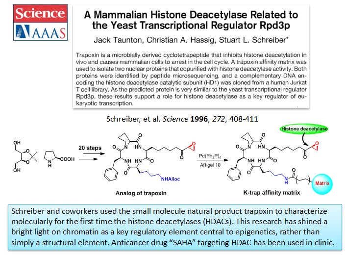 另外一個類似的工作是他們在1996年發(fā)表在Science文章上的,當時他們也是利用一個具有抗腫瘤活性的天然產(chǎn)物,叫做trapoxin他們實現(xiàn)了這個化合物的合成,而且進一步的把這個天然產(chǎn)物探針化,通過靶點垂釣實驗,發(fā)現(xiàn)這個天然產(chǎn)物的生物靶點實際上叫做組蛋白去乙?;?/span>,這個酶實際上是在我們細胞的有絲分裂過程中起到一個非常重要的調(diào)控作用。基于這個重要的生物學發(fā)現(xiàn),后邊有很多的生物學家也進行了相應的功能的研究,而且這個工作不光是發(fā)現(xiàn)了一個天然產(chǎn)物的靶點蛋白,進一步開拓了一個新興的生命科學的研究領(lǐng)域,大家現(xiàn)在可能都非常熟悉的,表觀遺傳學的研究領(lǐng)域。而且有證明這個組蛋白去乙?;笇嶋H上在腫瘤增殖過程中,起到一個非常關(guān)鍵的調(diào)控作用,所以后邊他們也開發(fā)出了相應的小分子抑制劑,并且已經(jīng)證明作為一個有效的抗腫瘤藥物,目前已經(jīng)在臨床上被廣泛的使用了。