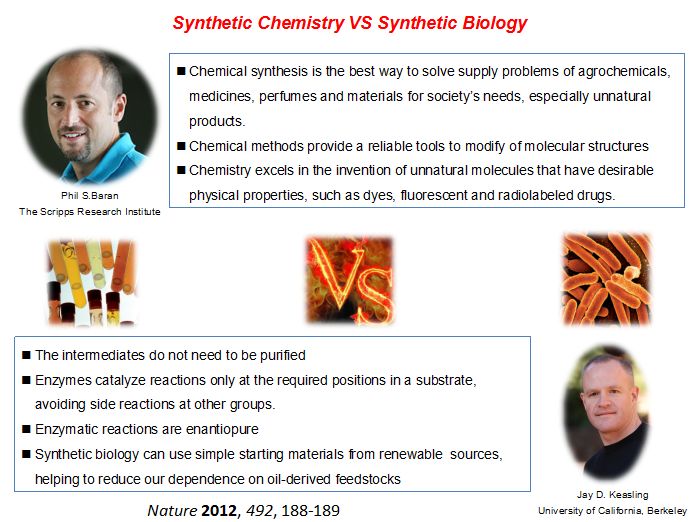 合成化學對于人類社會的發(fā)展具有非常重要的作用,推進作用,但是目前合成化學也存在很多瓶頸和挑戰(zhàn)。所以在2012年,當時Nature就有這么一個評述性的文章,它請了兩個非常著名的科學家,一個是合成化學領(lǐng)域非常有名的科學家Phil S.Baran教授以及合成生物學領(lǐng)域的Jay D.Keasling教授,他們共同的討論合成化學和合成生物學的不同以及相應的哪一個孰優(yōu)孰劣,以及如何能夠把這兩個學科整合在一起。所以傳統(tǒng)上認為相對簡單的一些小分子,其實可以更有效的通過合成化學來制備。但是像很多復雜的分子,比如說像紫杉醇這類的天然產(chǎn)物分子,可能合成生物學有更大的優(yōu)勢。
