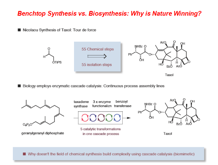 為什么會造成這么一個所謂的紫杉醇的難題?因為對于我們合成化學,特別是在人工合成的過程中,我們會遇到很多效率的問題,而且我們很多人工合成的策略都是一個線性的策略,從一個最原始的最簡單的原料S1出發(fā),我通過一步步的化學轉(zhuǎn)化,最終拿到TM(target molecule)。在這個過程中你可以設(shè)想,如果是一個四十步的合成,每一步合成你的產(chǎn)率如果只有50%的話,那你最終四十步的合成之后,你的產(chǎn)率是非常非常低的。所以這個遠遠的無法滿足實際生產(chǎn)的需求,這也是為什么我們會在合成化學里邊,特別是這種復雜分子多步合成的過程中,我們會面臨一個很巨大的挑戰(zhàn),會出現(xiàn)像紫杉醇的難題。所以合成化學今后也需要和其他的科學進行交叉融合,特別是和生命科學研究領(lǐng)域的生物合成,要進行相應的互補。
