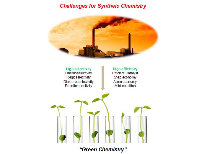 合成化學經(jīng)過近兩百年的發(fā)展,目前可能大家認為合成化學已經(jīng)成為一個非常成熟的學科,可能不太會有更進一步的發(fā)展?;蛘呱踔劣腥苏J為,合成化學目前也存在著很多巨大的瓶頸和挑戰(zhàn),比如說我們?nèi)绾文軌驅(qū)崿F(xiàn)高效精準的合成,在這里邊涉及到很多的選擇性的問題,比如說Chemoselectivity、Regioselectivity、Diastereoselectivity、Enantioselectivity等等。還有一個很重要,又是合成化學的效率,是不是能夠真正保證我們實現(xiàn)這些目標分子的有效工業(yè)化,能不能降低他的生產(chǎn)成本,特別是還要降低它對于環(huán)境的污染。實際上我們合成化學家也要面臨很多的挑戰(zhàn),而且我們也需要深入思考今后的合成化學將要朝什么樣的方向去發(fā)展,特別是如何能夠把合成化學變成更為綠色的化學。