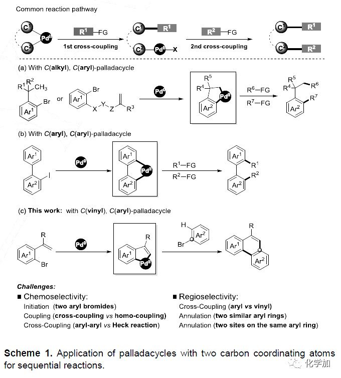 發(fā)展高效的合成方法和提高方法的應(yīng)用價值,是現(xiàn)代有機(jī)合成化學(xué)的目標(biāo)之一。串聯(lián)反應(yīng)常??梢栽谝徊椒磻?yīng)中實現(xiàn)多個組分的官能團(tuán)化,因此引起了化學(xué)家們的廣泛關(guān)注。而C-C環(huán)鈀物種作為一類重要的反應(yīng)中間體也被頻繁應(yīng)用于各種有機(jī)轉(zhuǎn)化中,但相關(guān)報道常見于C-C芳基/烷基環(huán)鈀和C-C芳基/芳基環(huán)鈀,有關(guān)C-C芳基/烯基環(huán)鈀的工作則相對較少。