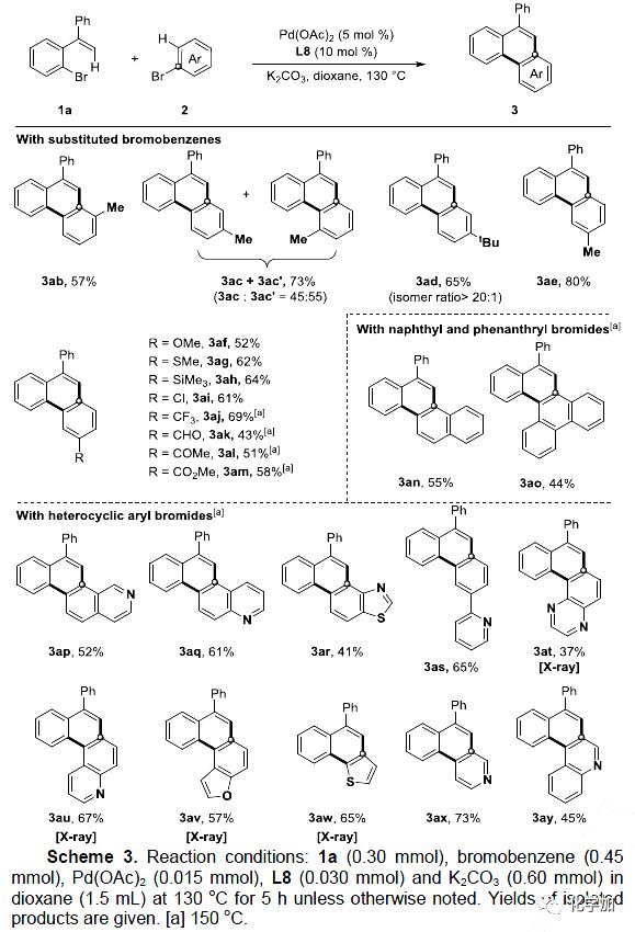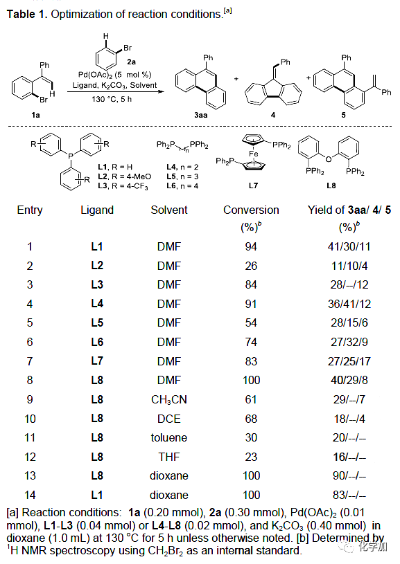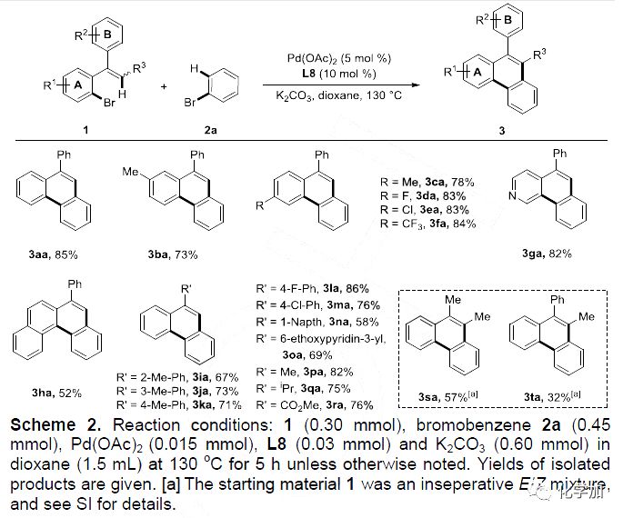 首先,作者以1a和2a為模型底物,考察了配體,溶劑等對反應(yīng)轉(zhuǎn)化率和收率的影響(Table 1)。該反應(yīng)在常見的雙膦和單膦配體下均可順利獲得菲類產(chǎn)物3aa,但是也伴有副產(chǎn)物芴類化合物4和雙分子聚合產(chǎn)物5。在隨后的溶劑考察中,這兩種副產(chǎn)物在L8為配體,dioxane為溶劑的體系中均可被有效地降低。另外,L1作為配體在該溶劑體系下,也可使反應(yīng)獲得理想的產(chǎn)率。