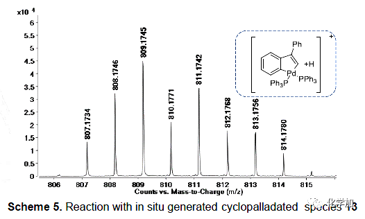 接下來,作者對反應(yīng)的機(jī)理進(jìn)行了研究。通過SAESI-MS (Scheme 5),順利地在分步反應(yīng)和反應(yīng)液中均捕捉到了活性較高而難于分離的環(huán)鈀中間體,通過高分辨質(zhì)譜,二級碎片及同位素分布分析,證實了該中間體的存在。而同位素動力學(xué)實驗則闡明了兩個C-H斷裂過程對反應(yīng)速率的影響。基于此,作者提出了兩種可能的催化循環(huán),根據(jù)一系列實驗結(jié)果認(rèn)為循環(huán)II為主要的機(jī)制(Scheme 6)。