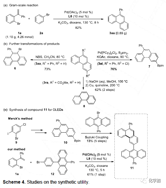 為了體現(xiàn)該方法的合成價值(Scheme 4),作者也實現(xiàn)了該反應(yīng)的克級規(guī)模放大和相關(guān)化合物的多種轉(zhuǎn)化。值得注意的是,Merck公司報道的通過5步以13%的產(chǎn)率合成的具有OLED效應(yīng)化合物11,利用該方法通過簡單和商品化的原料僅需一步反應(yīng),便能以61%的產(chǎn)率得到。