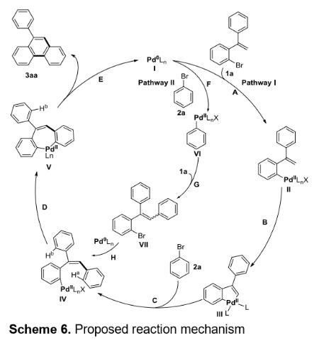 與此同時,稠環(huán)類化合物在天然產(chǎn)物化學(xué),藥物化學(xué),材料化學(xué)等領(lǐng)域都扮演著非常重要的角色。因此,發(fā)展合成該類化合物的方法是十分必要和極具意義的。近日,中國科學(xué)院上海有機(jī)所林國強(qiáng)研究員和上海中醫(yī)藥大學(xué)馮陳國課題組利用芳基/烯基環(huán)鈀的雙官能團(tuán)化策略,通過兩種芳基溴代物的串聯(lián)環(huán)化反應(yīng)成功地發(fā)展了一種合成稠環(huán)類化合物的新方法。
