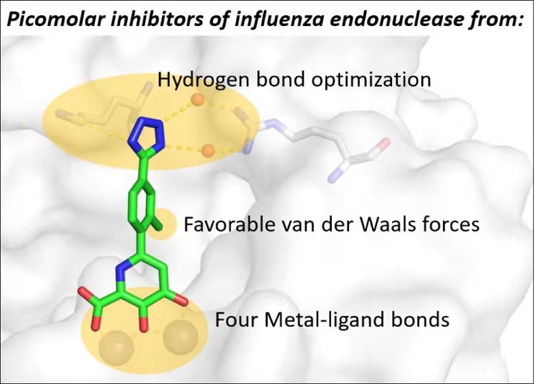 在抗流感病毒藥物的開發(fā)中,PAN核酸內(nèi)切酶抑制劑的研究獲得了廣泛的關(guān)注。課題組基于最近發(fā)現(xiàn)的抑制PAN內(nèi)切酶的高活性金屬結(jié)合藥效團(tuán)(MBPS),運用了基于片段的藥物挖掘策略(Fragment Based Lead Discovery),以配位化學(xué)和構(gòu)效關(guān)系分析(SAR)為指導(dǎo),發(fā)展了MBP骨架,并不斷提高其活性和選擇性,合成了具有高親和力和結(jié)合能力的流感核酸內(nèi)切酶抑制劑。同時,所開發(fā)的先導(dǎo)化合物對幾類相關(guān)的雙核和單核金屬酶具有高選擇性。結(jié)合生物無機(jī)和藥物化學(xué)的原理和方法,該團(tuán)隊創(chuàng)新性的開發(fā)了一系列高效的病毒PAN內(nèi)切酶抑制劑,具有良好的抗流感病毒活性。該工作為抗病毒藥物的研究以及新型抑制劑類藥物的開發(fā)提供了新的思路和策略。