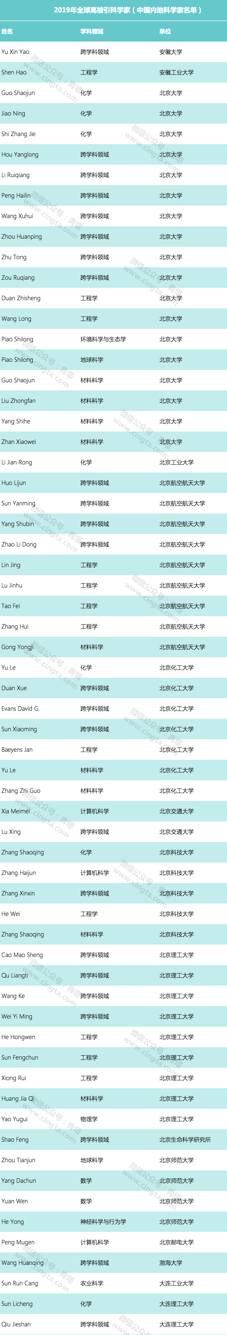 中國內(nèi)地上榜人數(shù)激增,本年度有636人次上榜,而2018年這一數(shù)字為482人次。2014年以來,在21 個(gè)ESI(Essential Science Indicators)學(xué)科領(lǐng)域中,中國內(nèi)地學(xué)者的上榜人數(shù)增加了3倍。包含港澳臺(tái)地區(qū),2019年中國共有735人次入榜高被引科學(xué)家。