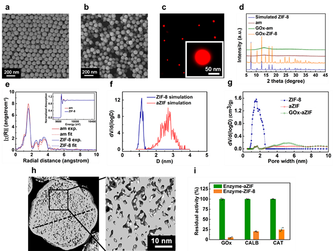 圖1. 無定形金屬有機骨架納米顆粒(a)以及酶-無定形金屬有機骨架復(fù)合物(b)的掃描電鏡圖;(c)酶-無定形金屬有機骨架復(fù)合物的超分辨熒光顯微鏡;(d)X-射線衍射;(e)X-射線吸收精細(xì)結(jié)構(gòu);(f)分子動力學(xué)模擬孔徑;(g)氮氣吸附實驗并通過NLDFT模型計算的孔徑分布;(h)冷凍電子斷層成像術(shù)直觀觀察到的酶-無定形金屬有機骨架復(fù)合物介孔;(i)包埋酶的表觀酶活性。